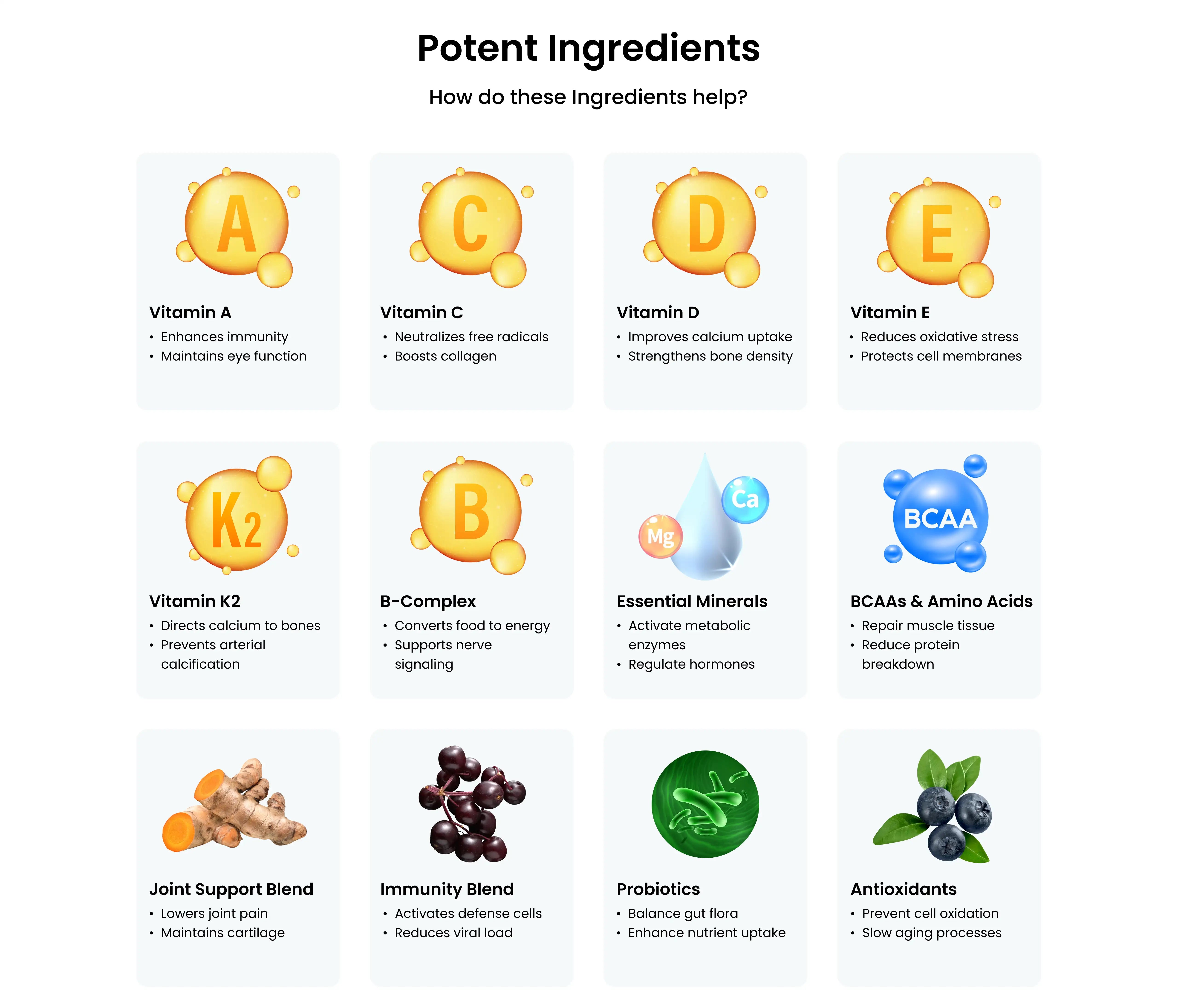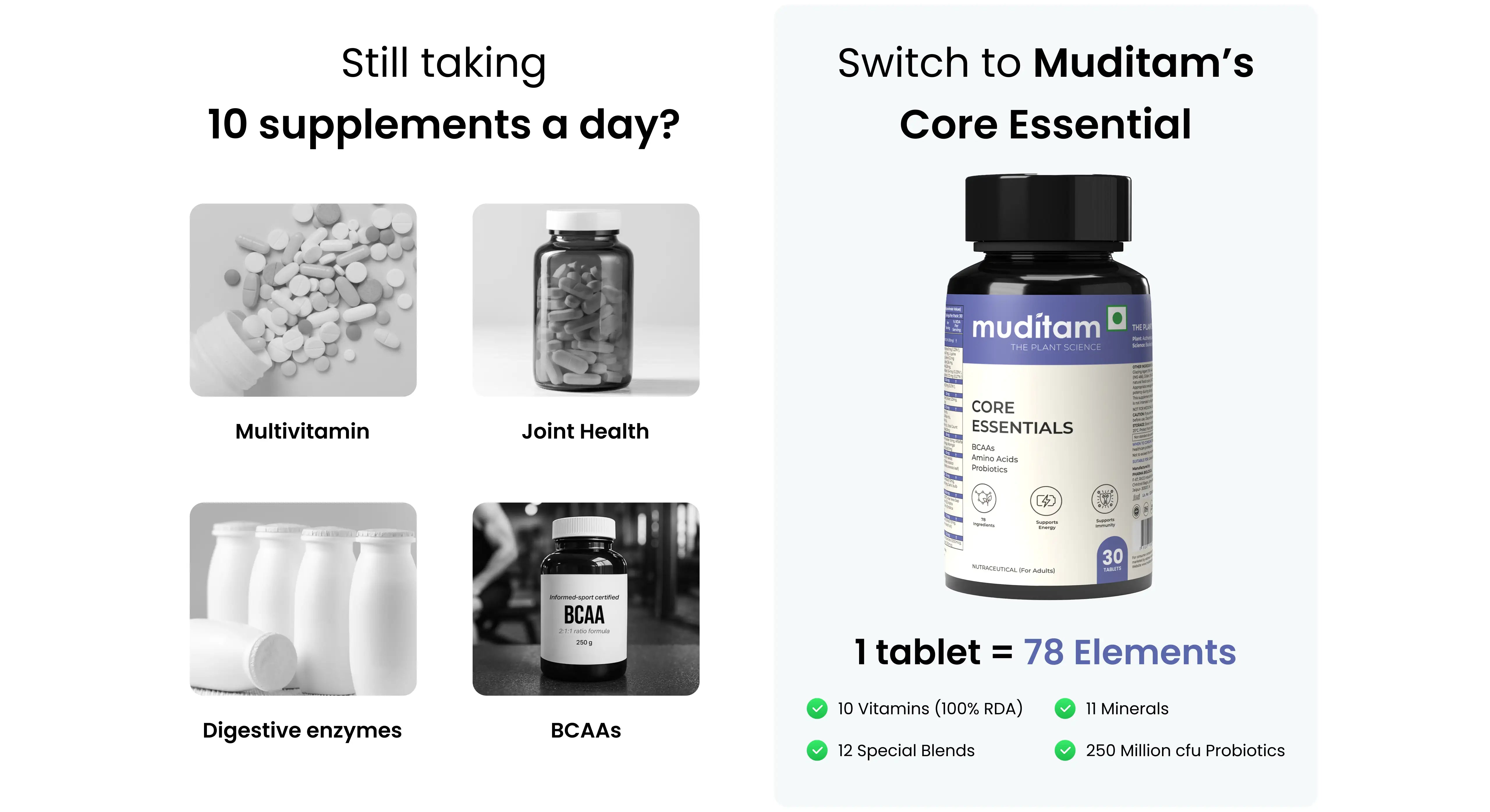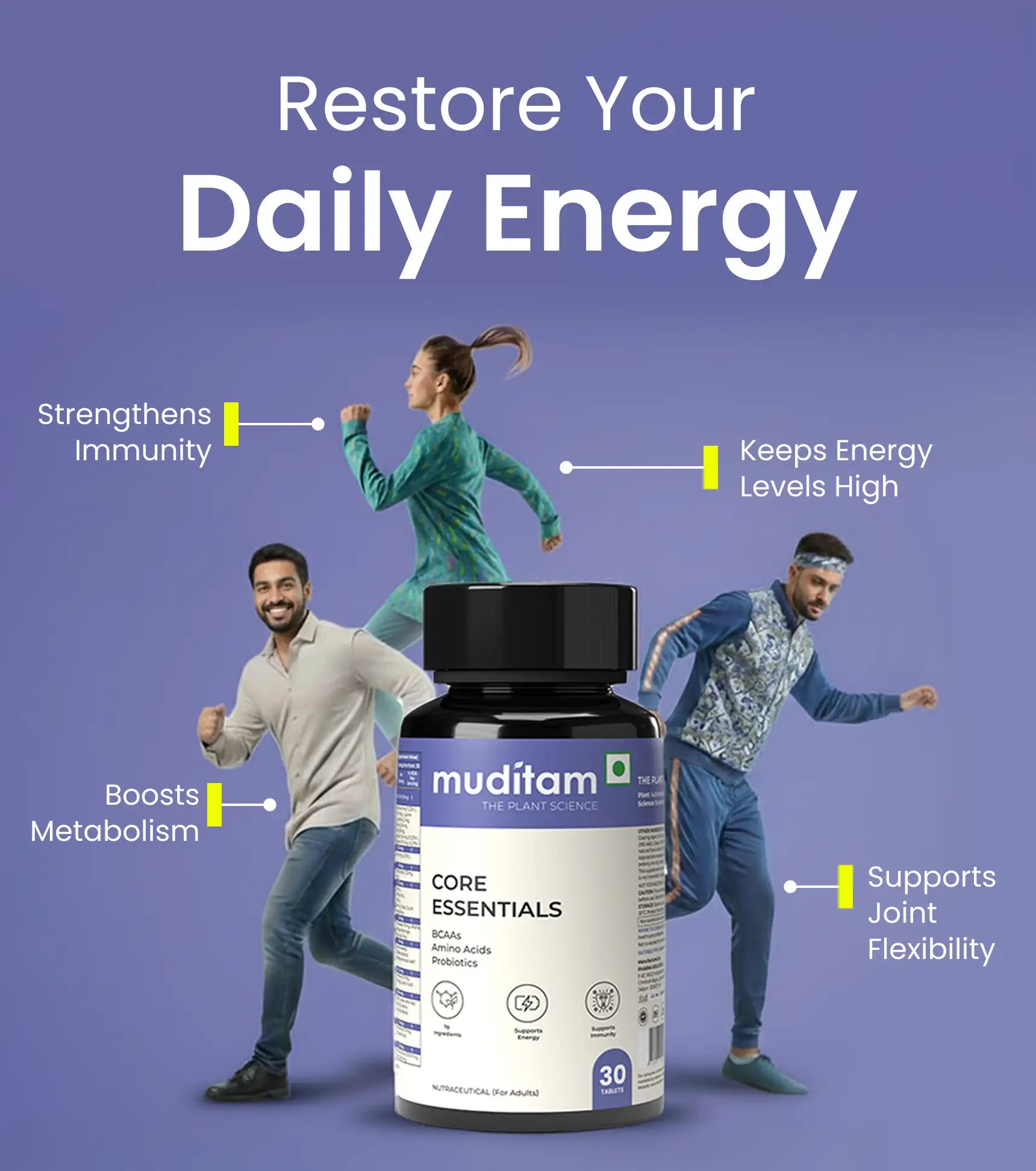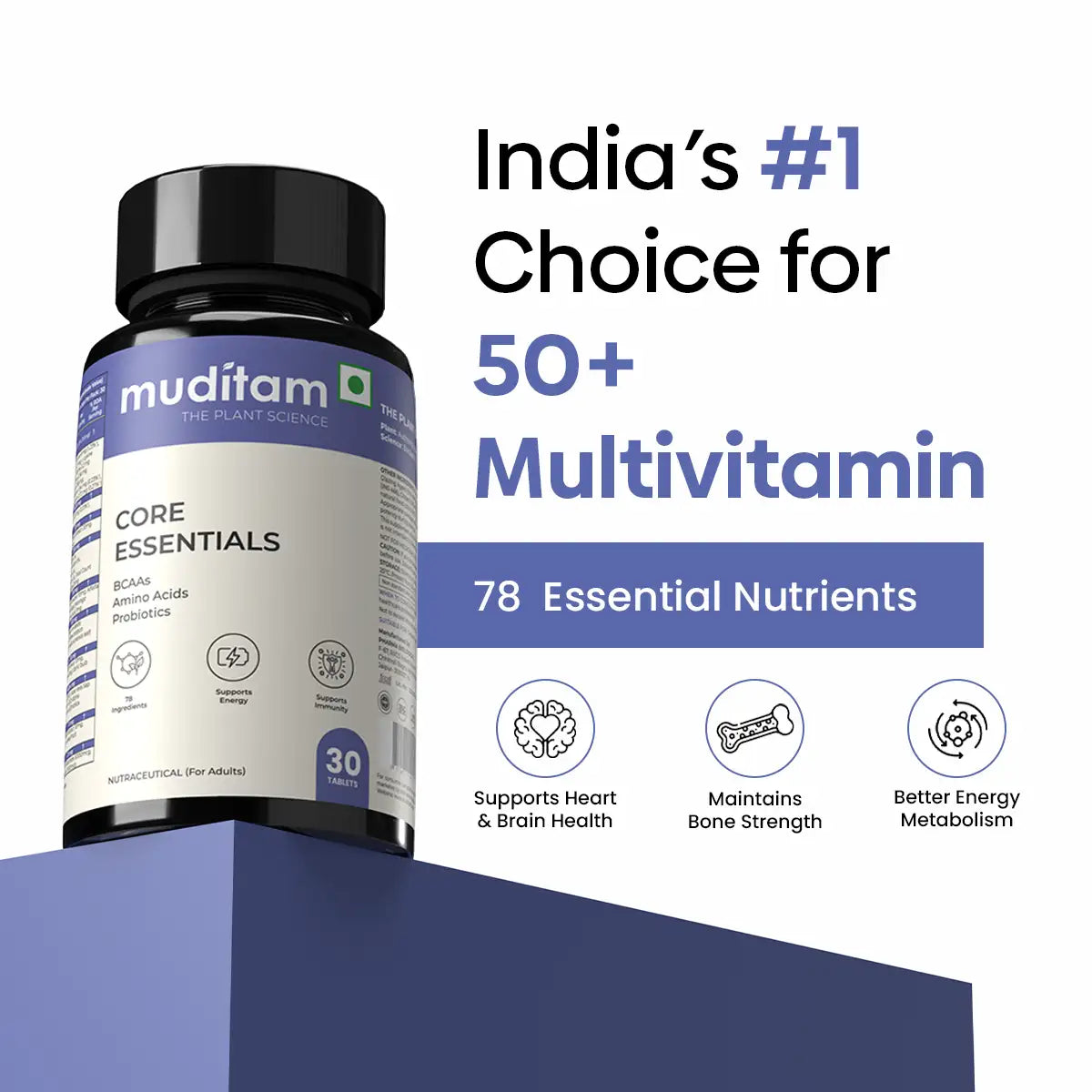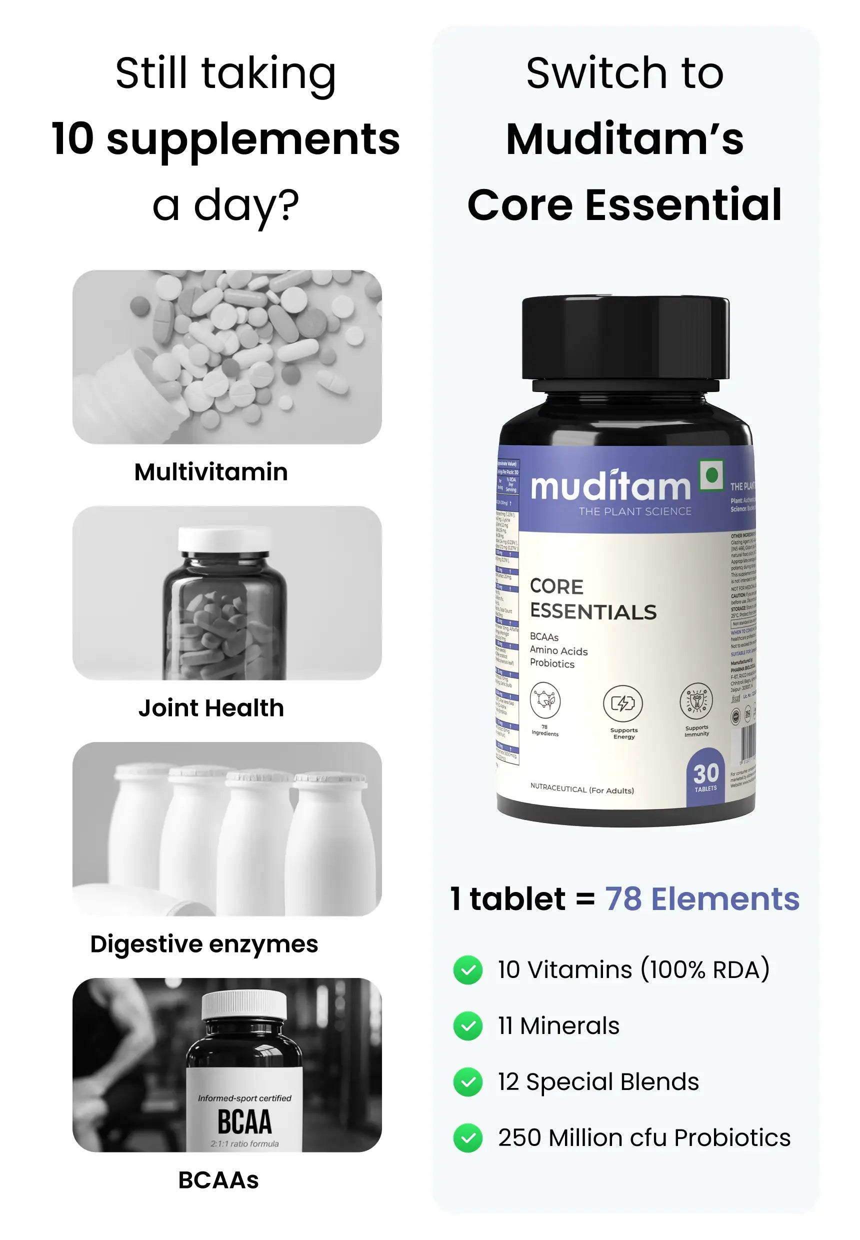 Core Essentials combines 78 nutrients across 12 unique blends — including Vitamins A, C, D, K, B-Complex, Minerals (Zinc, Magnesium, Iron, Selenium), Amino Acids & BCAAs, Probiotics, and herbal extracts like Ginseng, Curcumin, and Moringa. This advanced formula supports daily energy, stronger immunity, better digestion, joint strength, skin & hair vitality, and long-term wellness - all in one tablet.