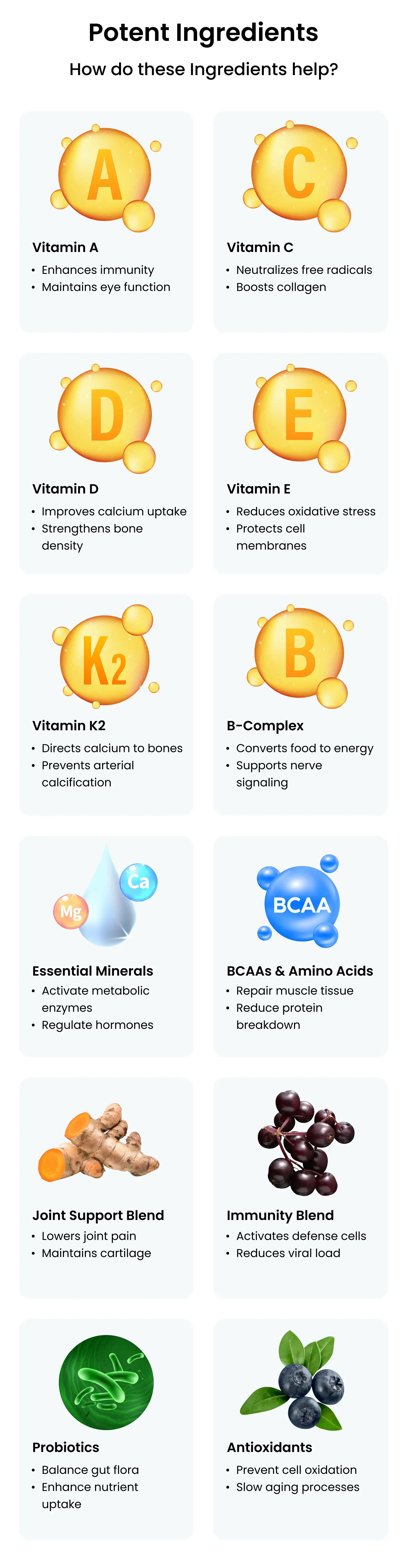 Vitamin B3 (as Nicotinamide) 18 mg, Vitamin B5 (as Calcium D Pantothenate) 5 mg, Vitamin B2 (as Riboflavin) 2.5 mg, Vitamin B6 (as Pyridoxine HCl) 2.4 mg, Vitamin B1 (as Thiamine Mononitrate) 1.8 mg, Vitamin A (as Retinyl Acetate) 1000 mcg, Vitamin B9 (as Folic Acid) 176.47 mcg, Vitamin K2 (as MK-7) 55 mcg, Vitamin D2 (as Ergocalciferol) (600 IU) 15 mcg, Vitamin B12 (as Cyanocobalamin) 2.2 mcg, Magnesium (from Magnesium Oxide 42.3 mg) 25.5 mg, Calcium (from Calcium Carbonate 48.75 mg) 19.5 mg, Zinc (from Zinc Sulphate) 17 mg, Iron (from Carbonyl Iron) 9.5 mg, Manganese (from Manganese Sulphate) 4 mg, Copper (from Cupric Sulphate) 1.7 mg, Chromium Picolinate 400 mcg, Iodine (from Potassium Iodide) 140 mcg, Boron (from Boric Acid) 75 mcg, Molybdenum (from Sodium Molybdate Dihydrate) 45 mcg, Selenium (from Sodium Selenite) 40 mcg, Panax Korean Ginseng Rhizome Extract (3% Ginsenosides) (100mg) & Echinacea purpurea Powder Extract (20mg), Cranberry (Vaccinium oxycoccos)- fruit dried Extract (5mg), Mixed Carotenoids(10%) (5000mcg), Grape Seed Extract- 95% Proanthocyanidin (2000mcg), Zeaxanthin 5% Powder(1000mcg), Elderberry (Sambucus nigra) Extract (1000mcg), Algae Powder Astaxanthin(10%) (Haematococcus pluvialis) (1000mcg), Alpha Lipoic Acid (500mcg), Lycopene (6% Powder) (500mcg), L-Glutamic Acid 12.36 mg, DL-Methionine 8 mg (1.23%^), L-Aspartic Acid 7.24 mg, L-Arginine 4.7 mg, L-Lysine 3.92 mg (0.20%^), L-Proline 3.2 mg, L-Serine 3.2 mg, L-Phenylalanine 3.2 mg (0.19%^), Glycine 2.56 mg, L-Tyrosine 2.38 mg (0.14%^), L-Alanine 2.38 mg, L-Threonine 2.26 mg (0.23%^), L-Histidine 1.54 mg (0.23%^), L-Cysteine 0.78 mg (0.3%^), L-Tryptophan 0.72 mg (0.27%^), Leucine 4.76 mg (0.18%^), Isoleucine 2.8 mg (0.21%^), Valine 2.8 mg (0.16%^), Chilgoza Pine (Pinus gerardiana Bark) Extract (20 mg), Kaunch Beej (Mucuna pruriens) (10mg), Lactobacillus acidophilus 62.5 Million cfu, Lacticaseibacillus rhamnosus 62.5 Million cfu, Bifidobacterium longum 62.5 Million cfu, Sacchromyces boulardii 62.5 Million cfu, Total Count 250 Million cfu, Fructooligosachharides (25mg), Turmeric (Curcuma longa Rhizome) Powder (10mg), Alfalfa (Medicago sativa) Extract (10mg), Moringa (Moringa oleifera) Bark Powder (5mg), Hyaluronic acid (1mg), Fenugreek (Trigonella-foenum-graecum-seeds) Extract (20mg), Green Coffee Bean (Coffee arabica seeds) Extract (10mg), Green Tea (Camellia sinensis leaf) Extract (10mg), Papain (10mg), Bromelain (Ananas comosus) (10mg), Alpha Amylase (5mg), Lipase Enzyme (5mg), Garlic bulb (Allium sativum) Extract (5mg), Vitamin C (L-Ascorbic Acid) 20mg (25%*), Aloe Vera Sap Extract (Concentrated) 10mg, Vitamin E(D-Alpha Tocopheryl Acetate) 10mg (100%*), Amla (Emblica officinalis-dried fruit) Extract 5mg (100%*), Brahmi Extract (Leaf) (10mg), Choline Bitartrate (5000mcg), Inositol (5000mcg), Lutein (6% Powder) (1000mcg), Flaxseed (Linum usitatissimum seed) Extract (10mg), Blueberry (Vaccinium corymbosum-dried fruit) concentrate (1000mcg) Other Ingredients: Diluent (INS 460 (i), INS 341 (iii)), Binder (Maize starch), Glazing Agent (INS 464), Anticaking Agent (INS 553(iii)), Thickening Agent (INS 466), Glidant (INS 470(iii)) & Potassium Sorbate (INS 202), Contains permitted natural food colors (INS 172(i), INS 172(ii), INS 172(iii)).