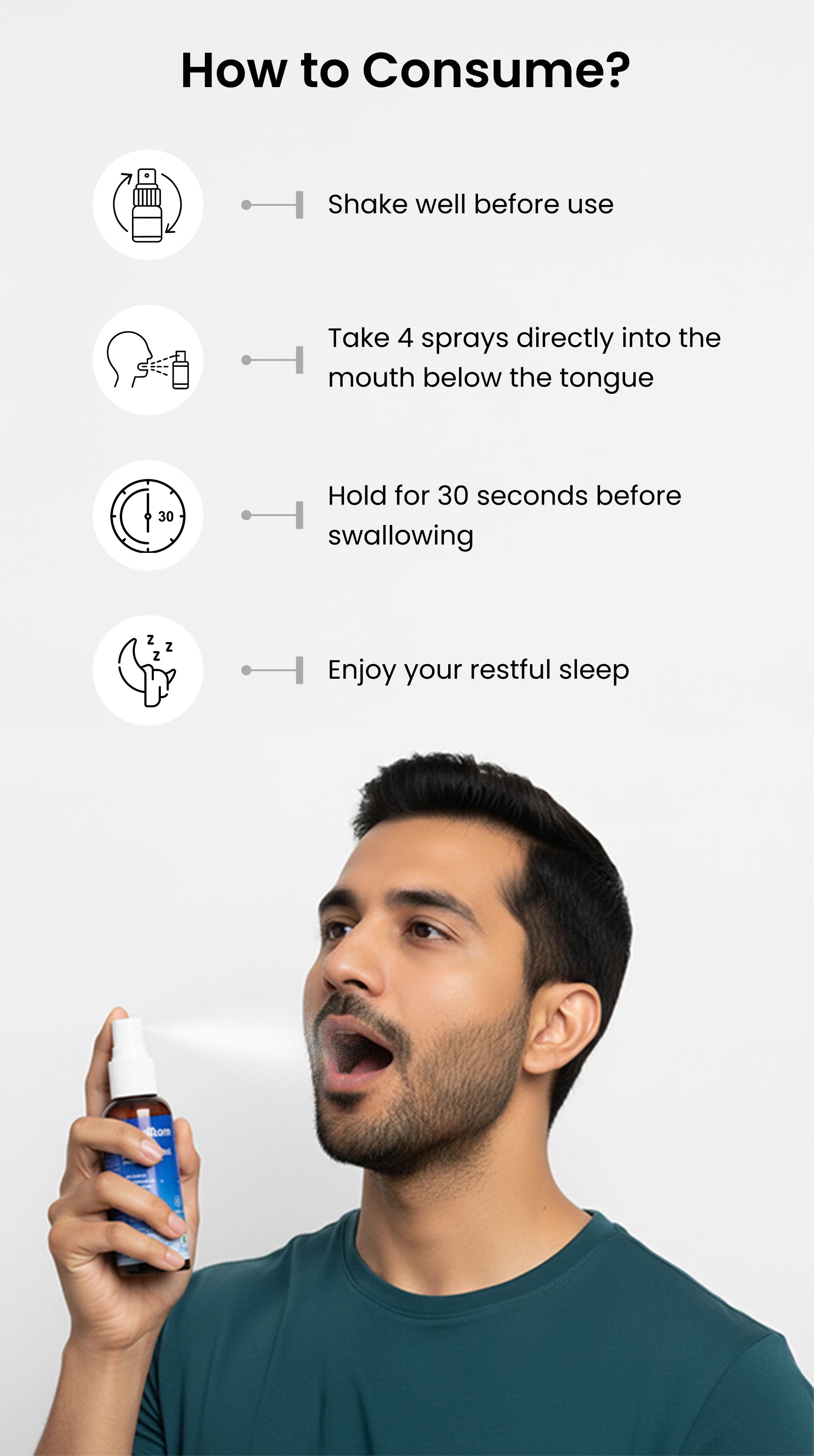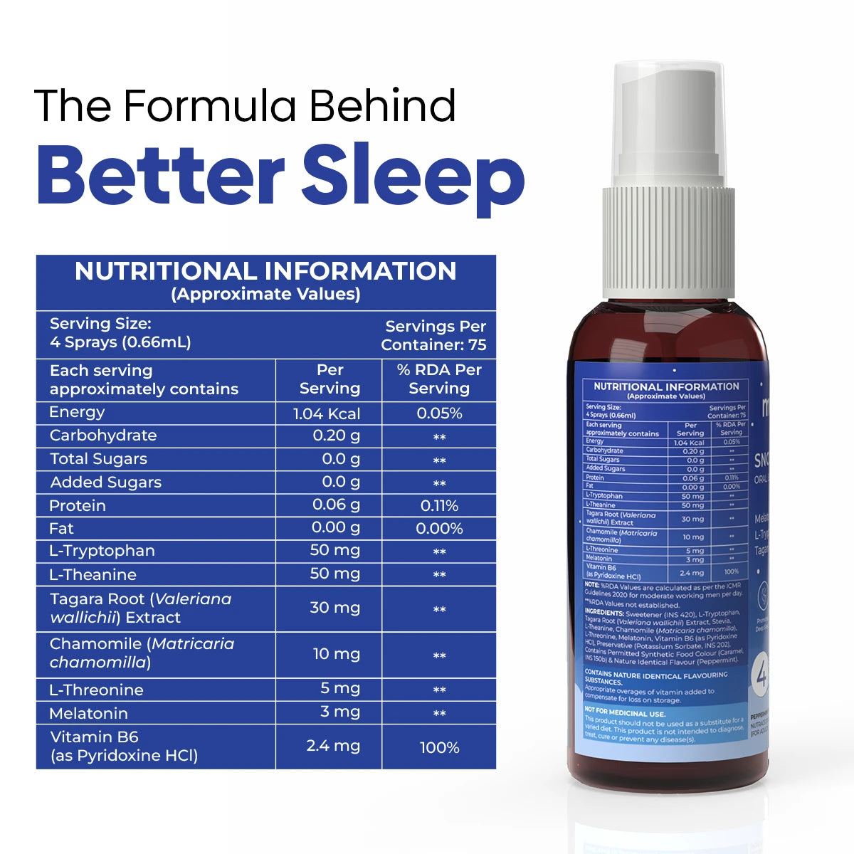 L-Tryptophan,Tagara Root (Valeriana wallichii) Extract, Stevia, L-Theanine, Chamomile (Matricaria chamomilla), L-Threonine, Melatonin, Vitamin B6 (as Pyridoxine HCl), Preservative (Potassium Sorbate, INS 202), Contains Permitted Synthetic Food Colour (Caramel, INS 150b), Sweetener (INS 420) & Nature Identical Flavour (Peppermint)