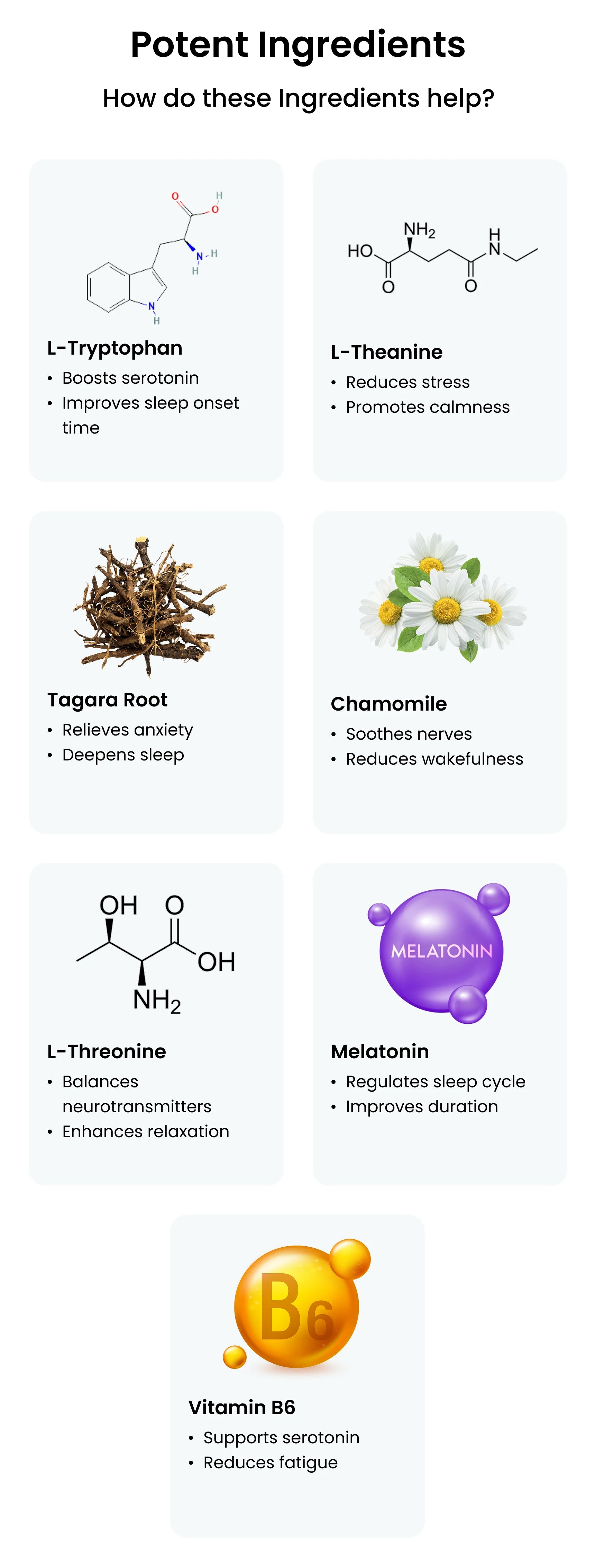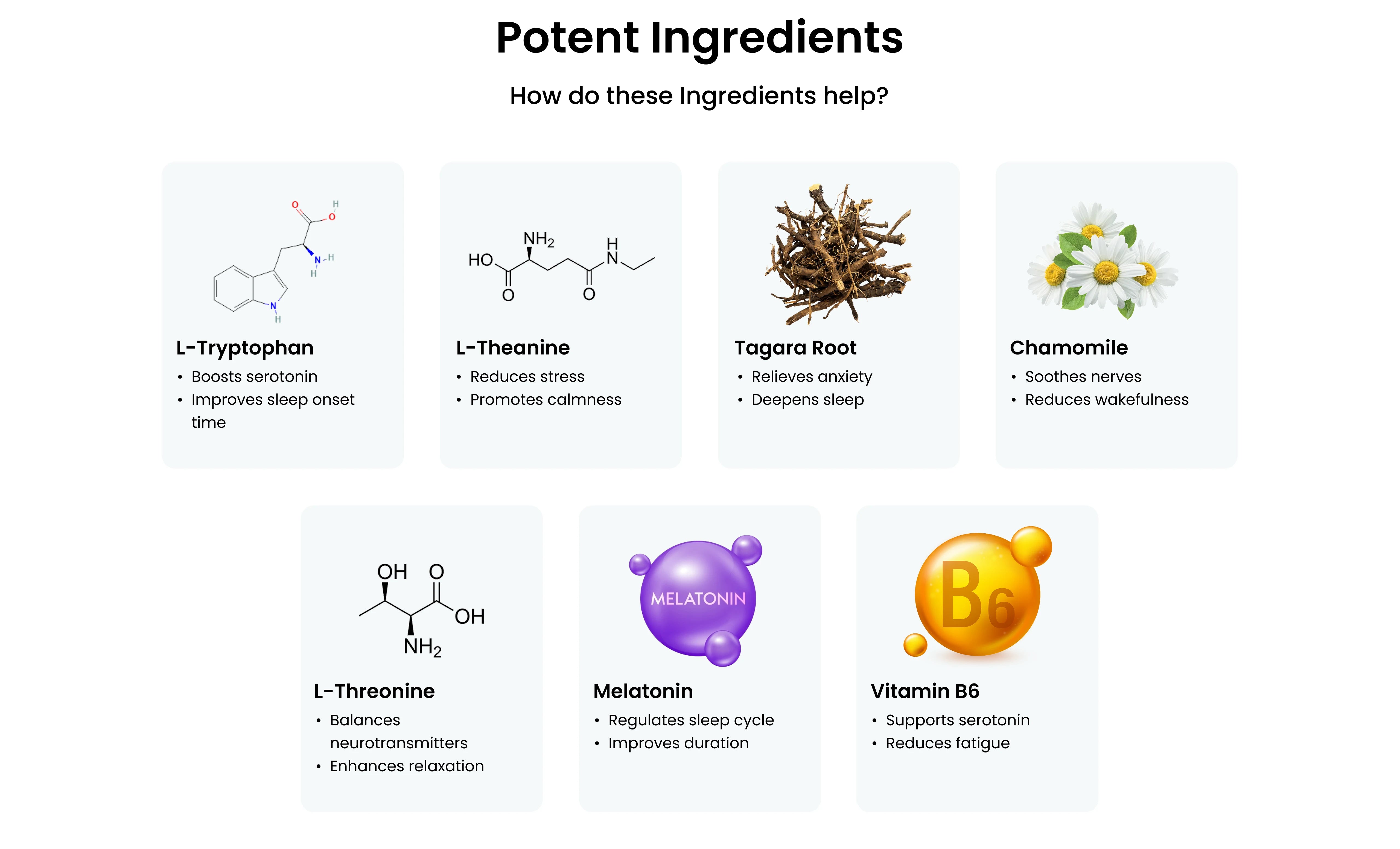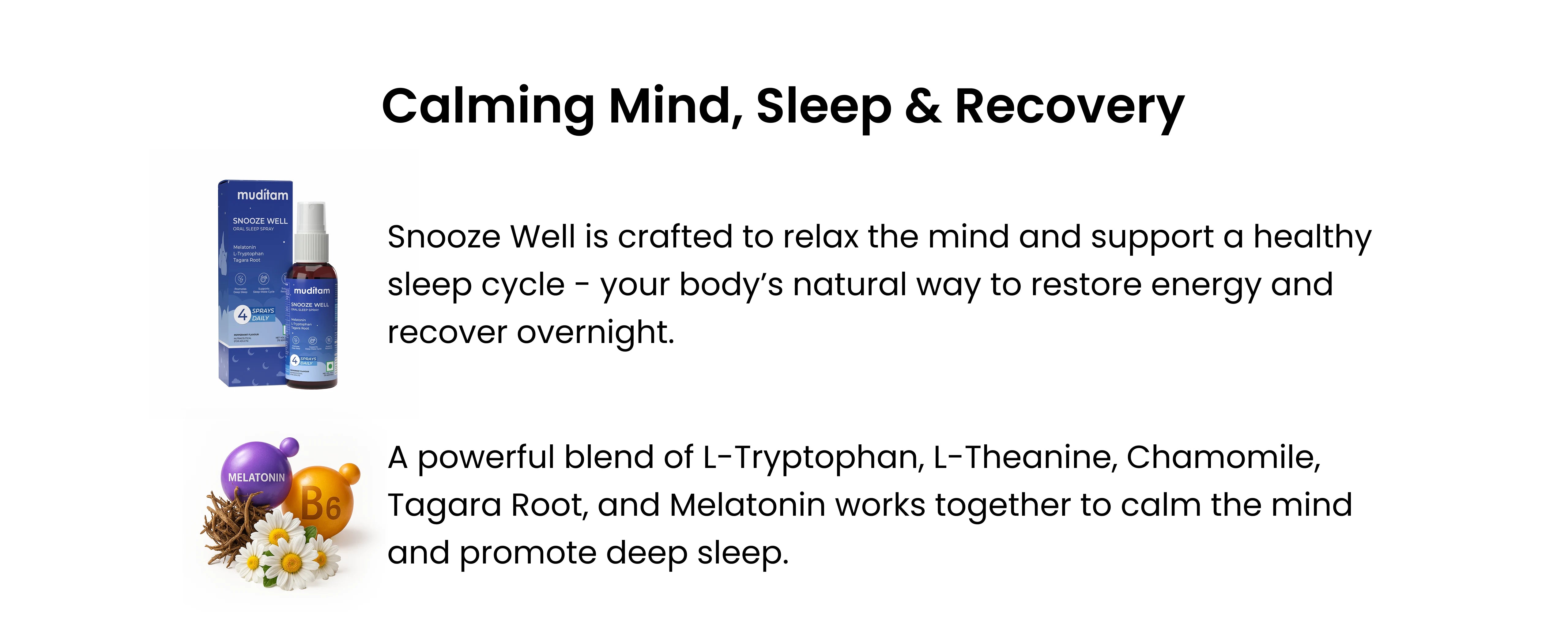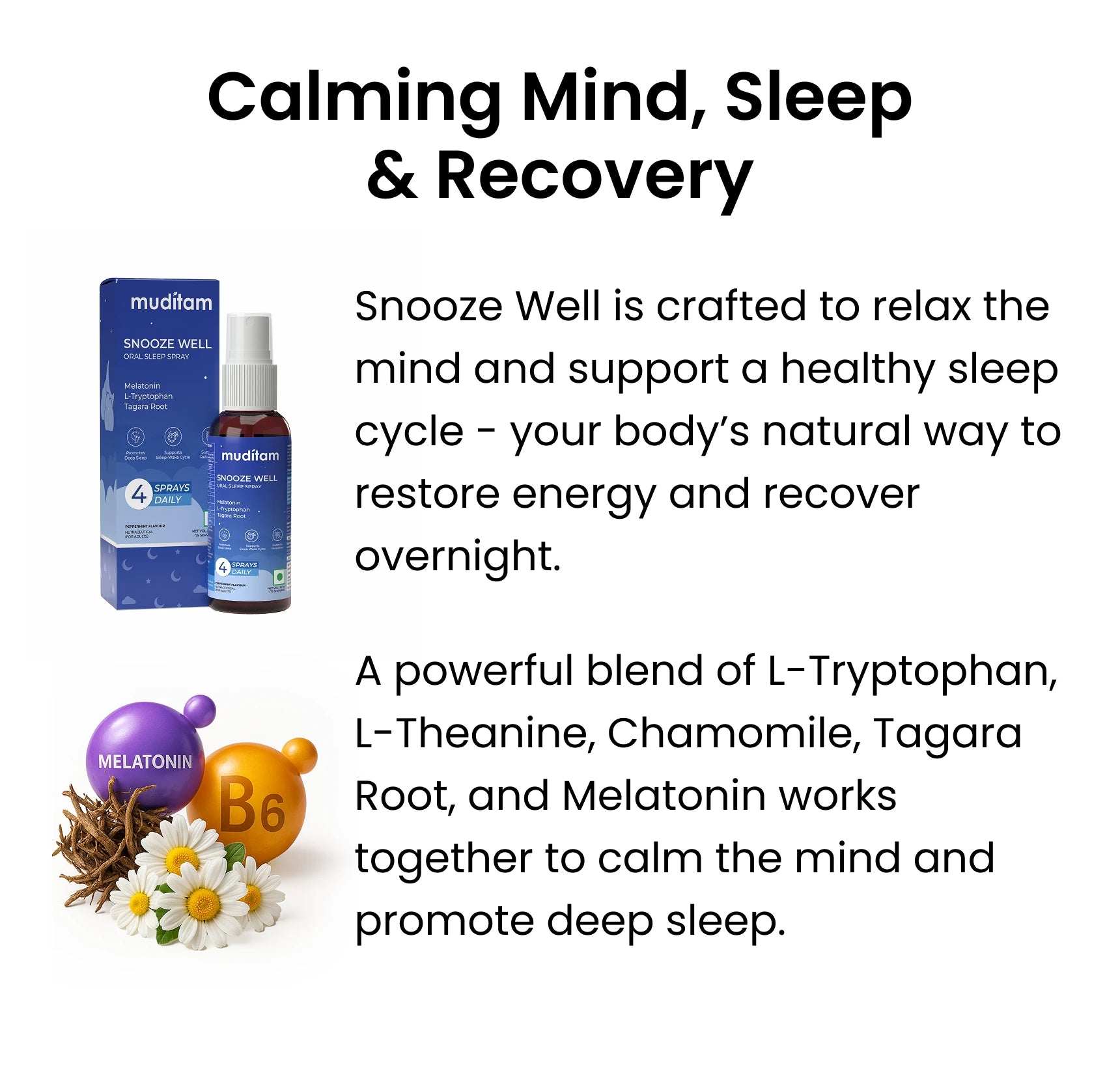 Snooze Well contains Tagara Root, Chamomile, L-Theanine, L-Tryptophan, and Melatonin, ingredients that are traditionally and clinically known to support relaxation, reduce stress, and promote healthy sleep patterns.