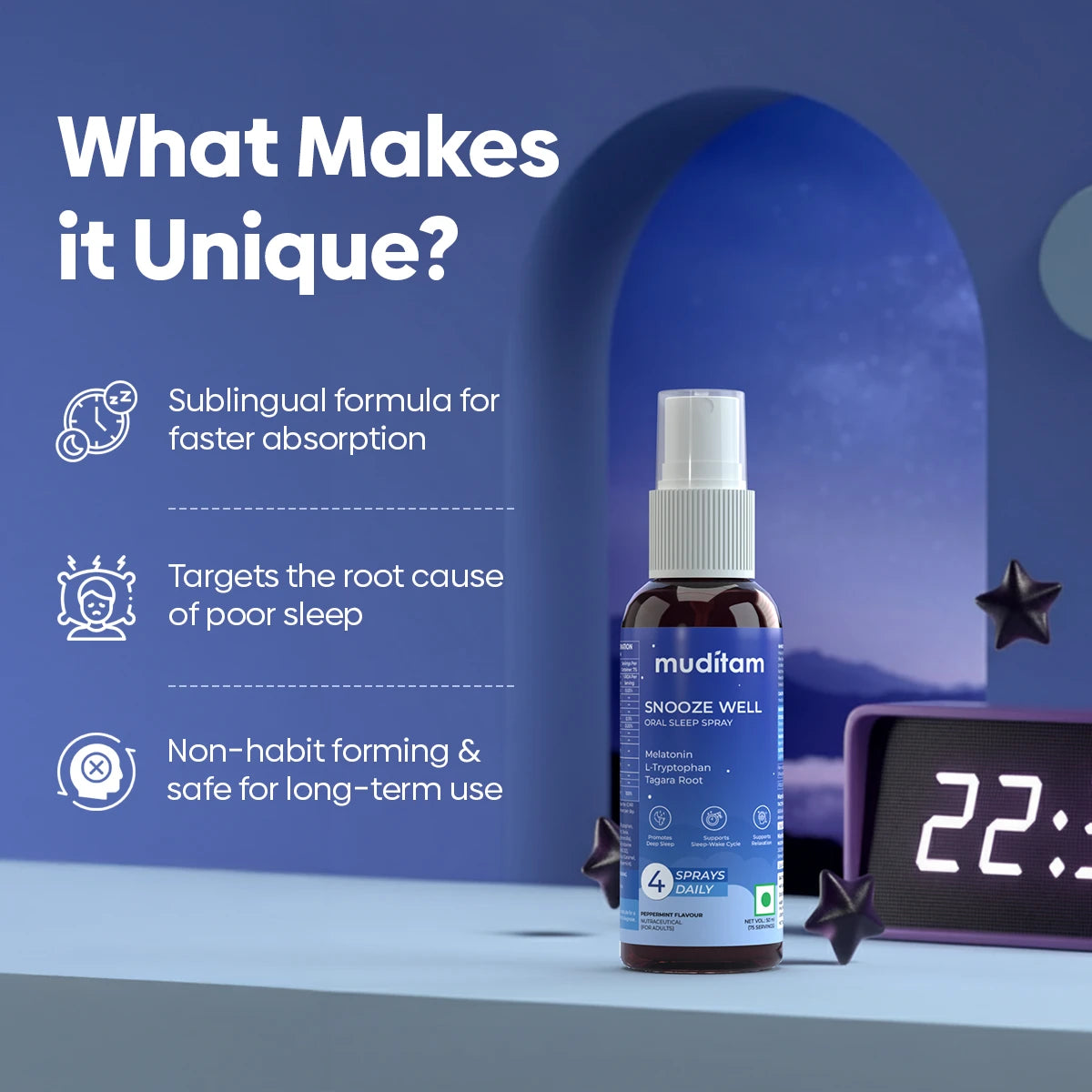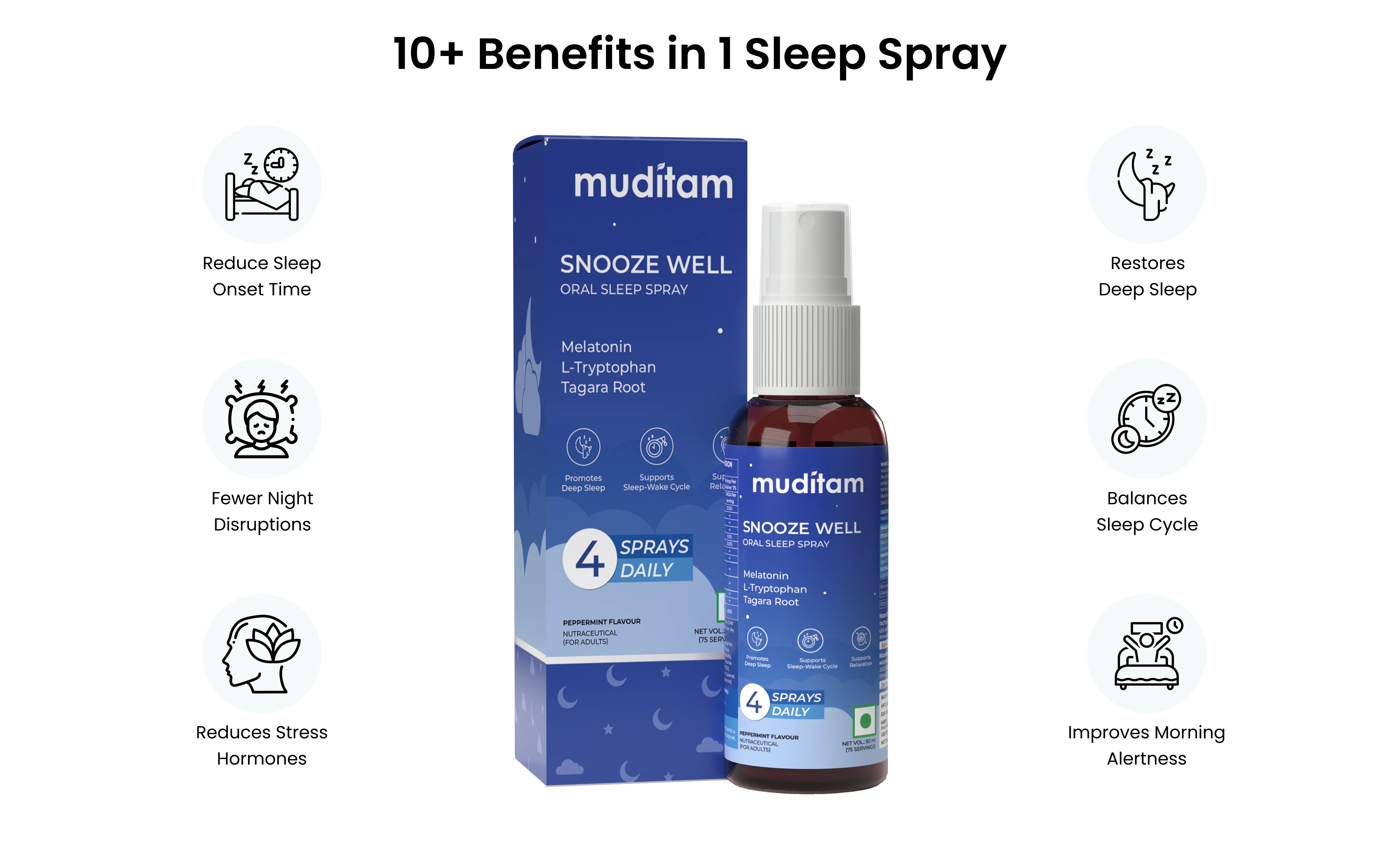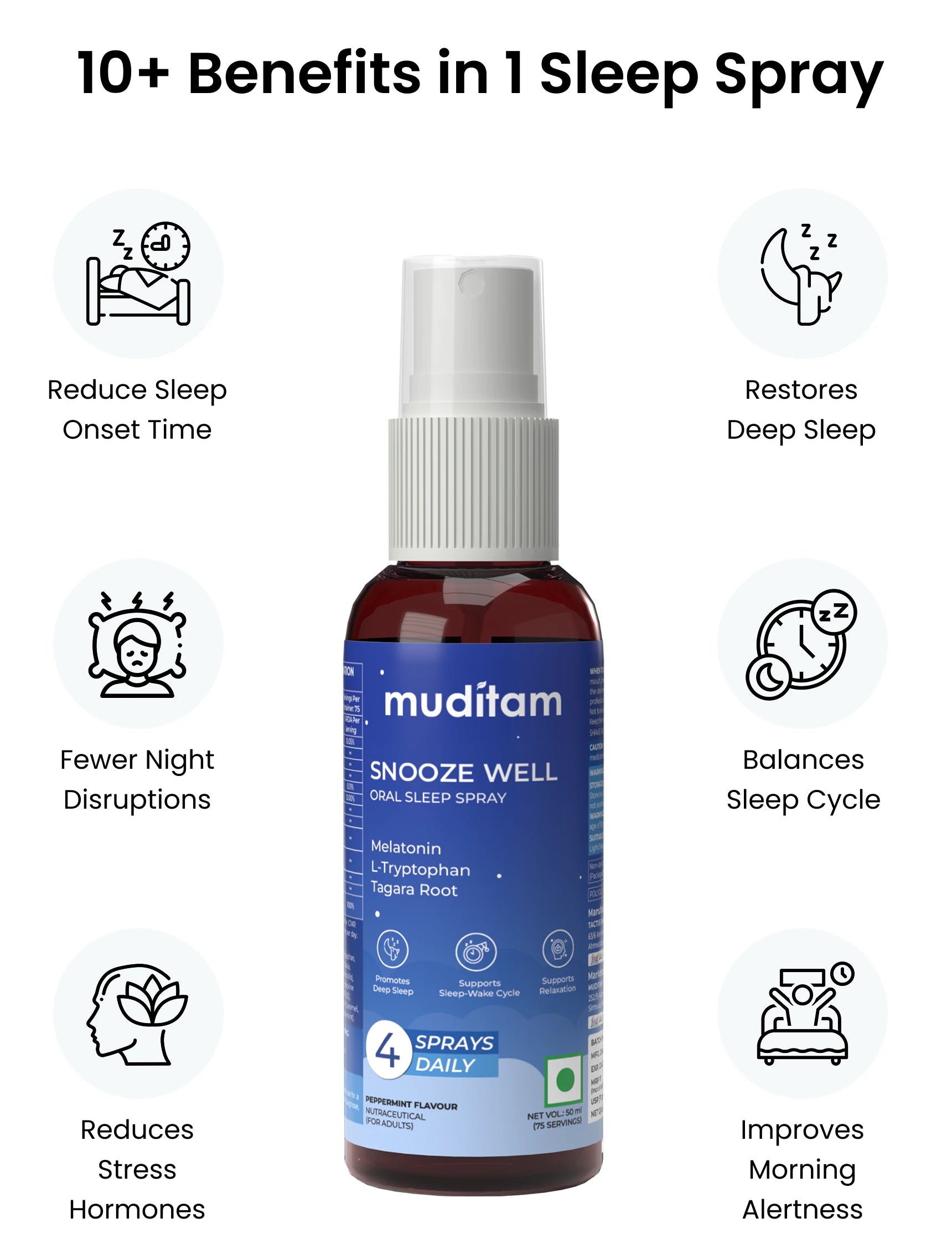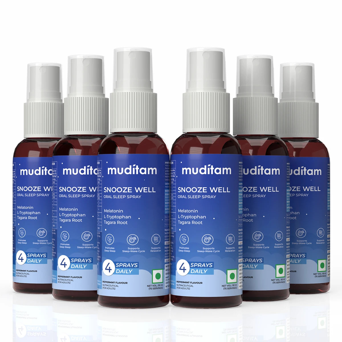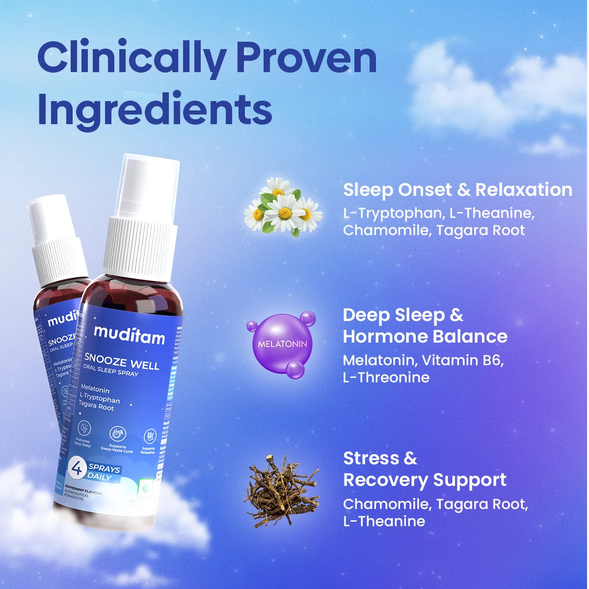 Snooze Well contains Tagara Root, Chamomile, L-Theanine, L-Tryptophan, and Melatonin, ingredients that are traditionally and clinically known to support relaxation, reduce stress, and promote healthy sleep patterns.