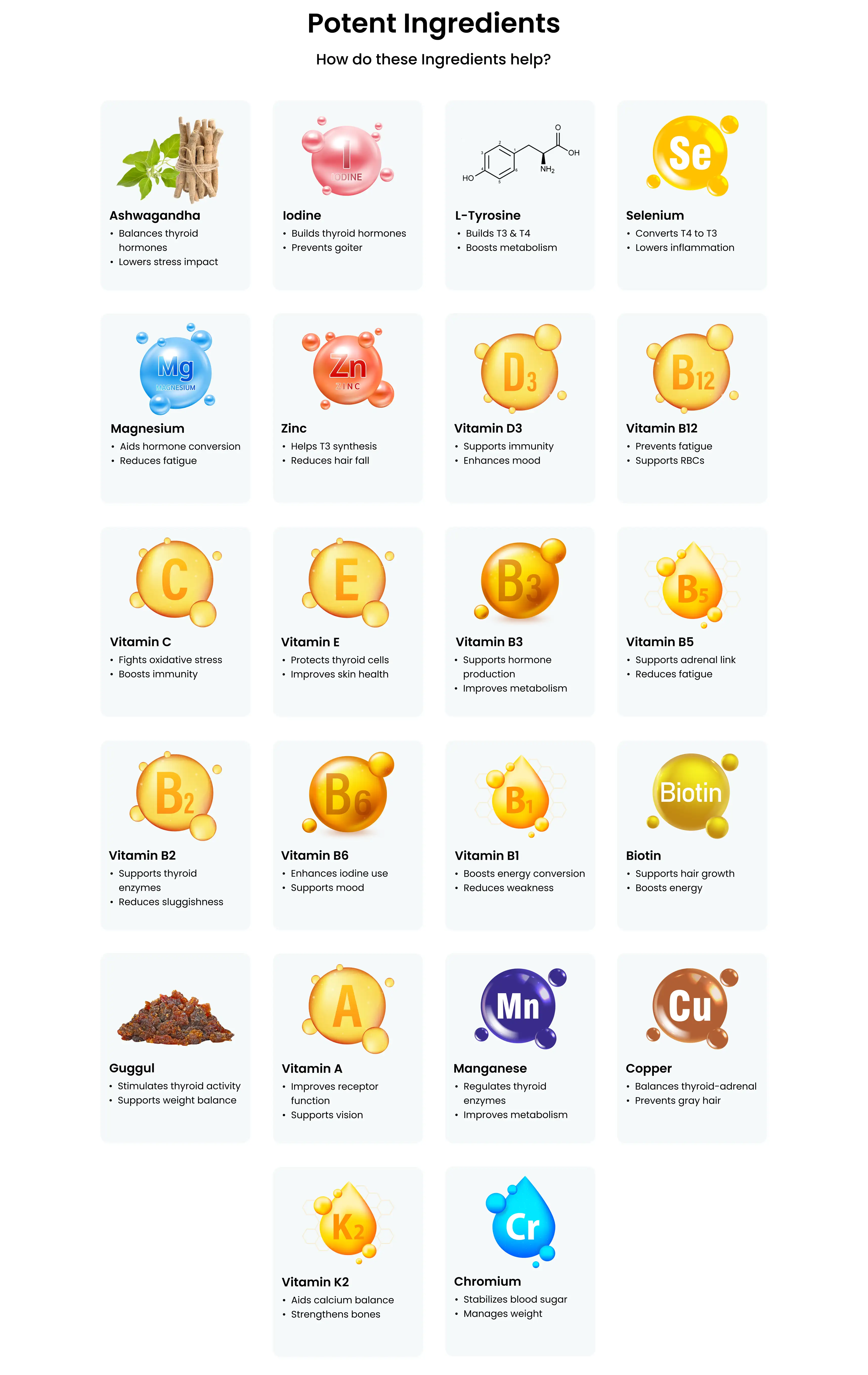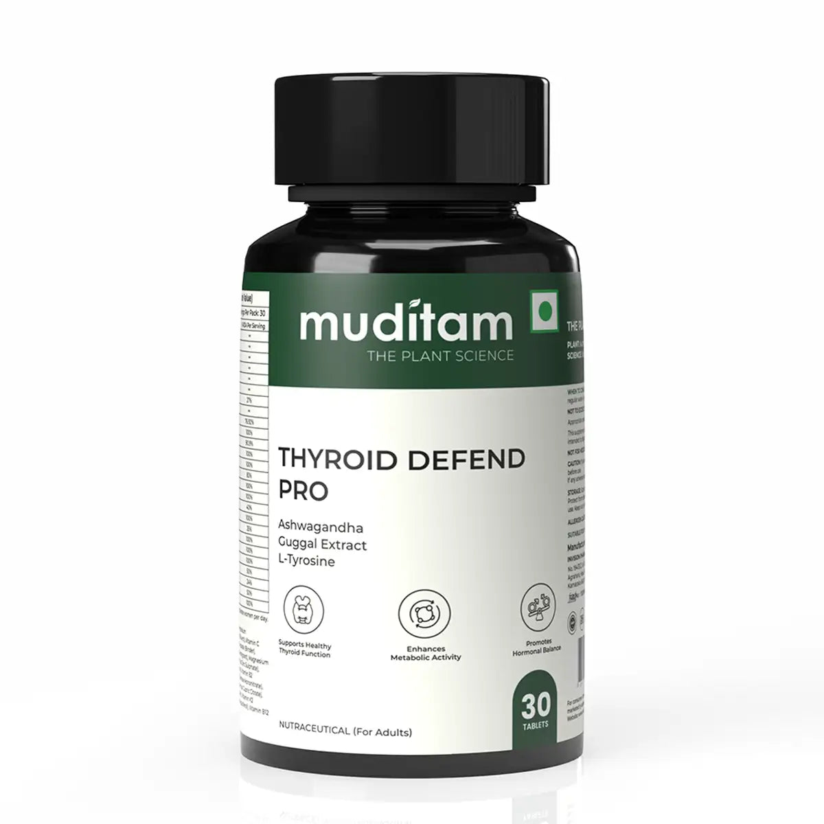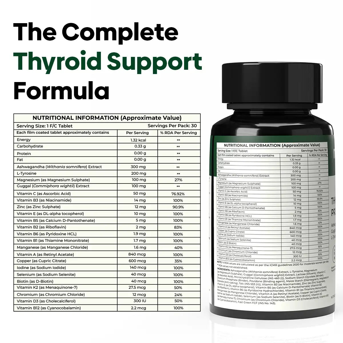 Ashwagandha (Withania somnifera) Extract, L-Tyrosine, Magnesium (as Magnesium Sulphate), Guggul (Commiphora wightii) Extract, Lactose (Diluent), Vitamin C (as Ascorbic Acid), Microcrystalline Cellulose (INS 460 (i)), Sodium Starch Glycolate (Binder), Dicalcium Phosphate (Binder), Povidone (Binding agent), Maize Starch (Disintegrant), Magnesium Stearate (Anti-caking), Talc (INS 553 (iii)), Vitamin B3 (as Niacinamide), Zinc (as Zinc Sulphate), Vitamin E (as DL-Alpha Tocopherol Acetate), Vitamin B5 (as Pantothenic Acid), Vitamin B2 (as Riboflavin), Vitamin B6 (as Pyridoxine Hydrochloride), Vitamin B1 (as Thiamine Mononitrate), Manganese (as Manganese Chloride), Vitamin A (as Retinol Acetate), Copper (as Cupric Citrate), Iodine (as Sodium Iodide), Selenium (as Sodium Selenite), Biotin (as D-Biotin), Vitamin K (as Menaquinone-7), Chromium (as Chromium Chloride), Vitamin D3 (Cholecalciferol), Vitamin B12 (as Cyanocobalamin).