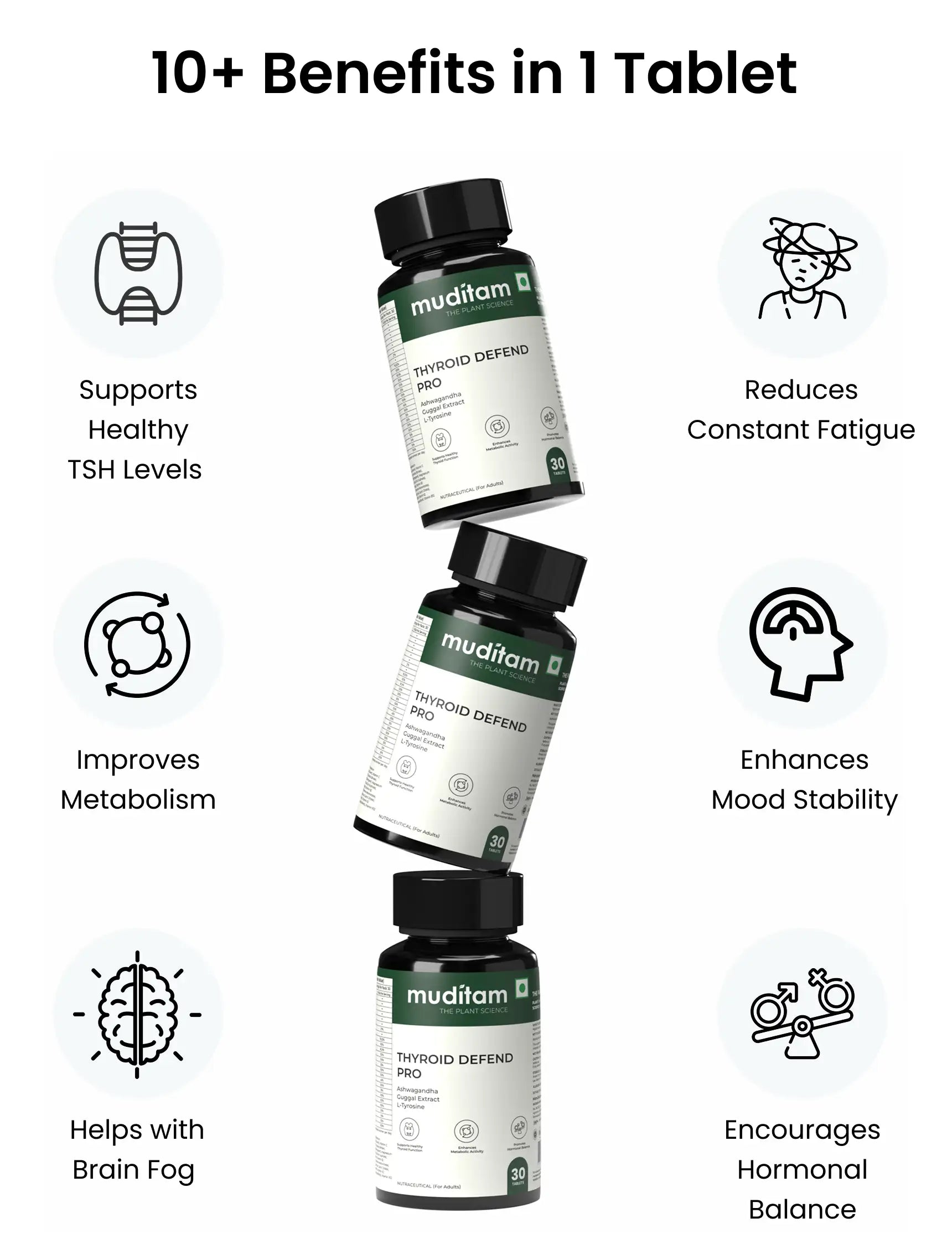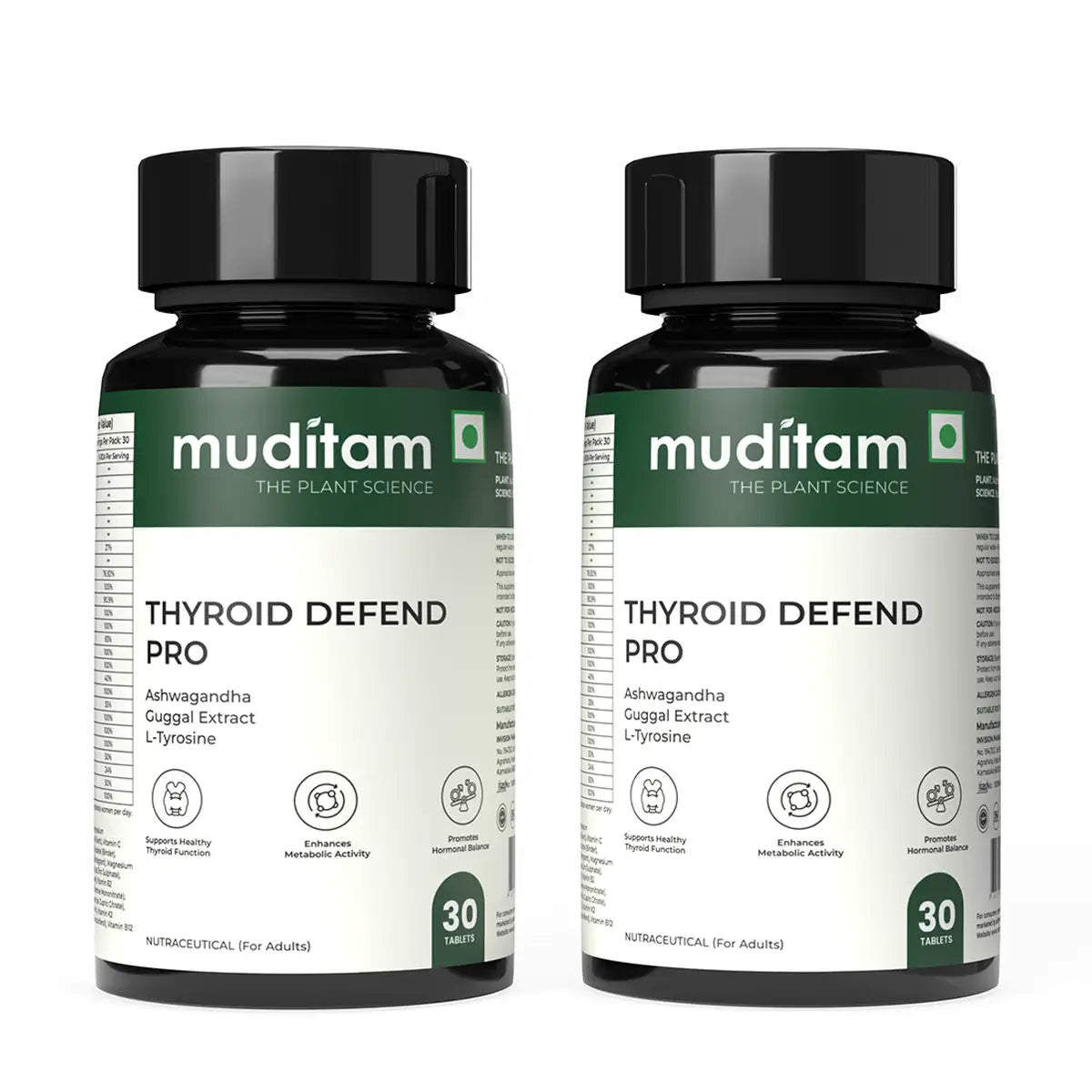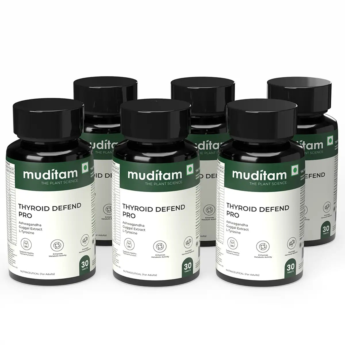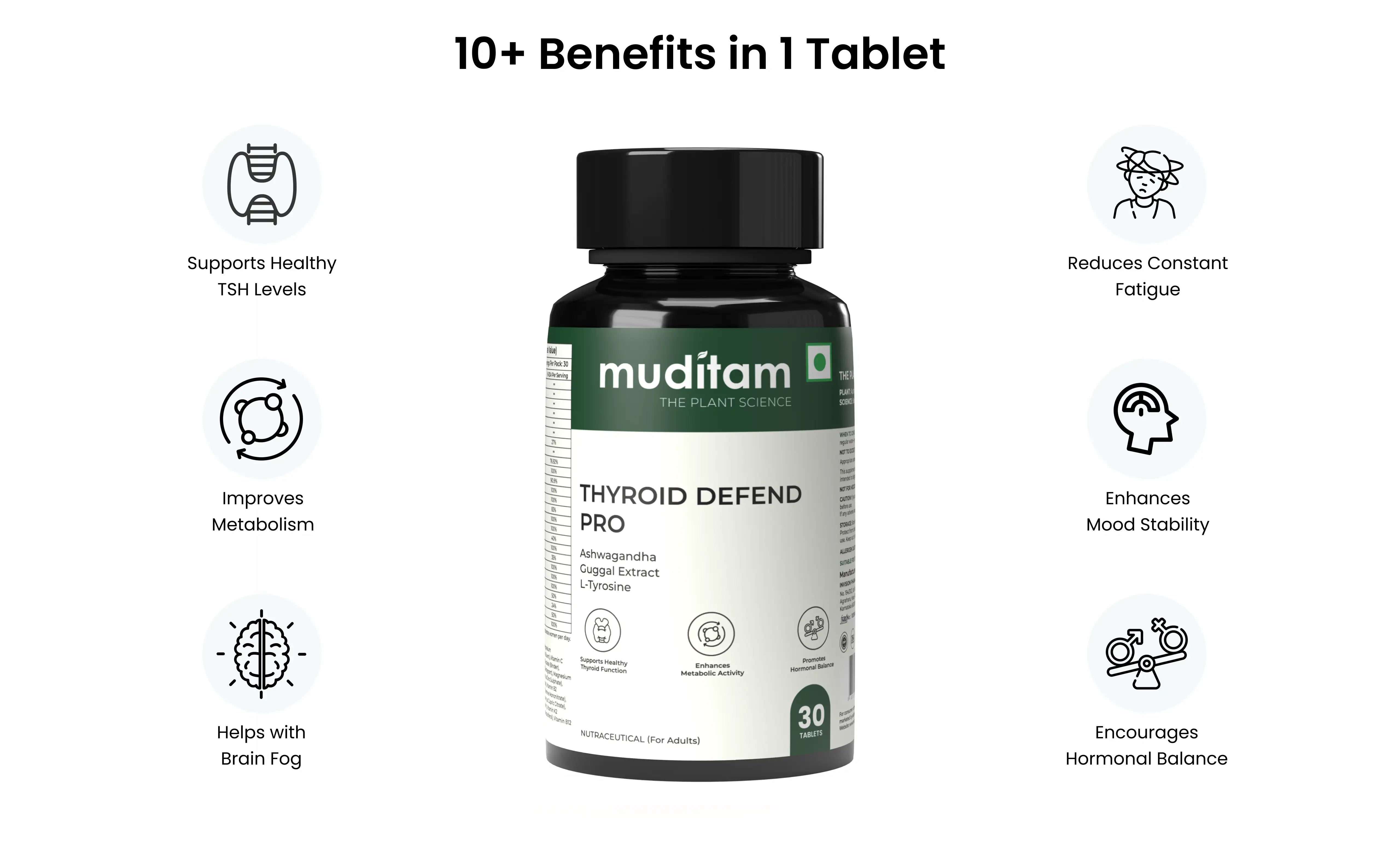 Ashwagandha (Withania somnifera) Extract, L-Tyrosine, Magnesium (as Magnesium Sulphate), Guggul (Commiphora wightii) Extract, Lactose (Diluent), Vitamin C (as Ascorbic Acid), Microcrystalline Cellulose (INS 460 (i)), Sodium Starch Glycolate (Binder), Dicalcium Phosphate (Binder), Povidone (Binding agent), Maize Starch (Disintegrant), Magnesium Stearate (Anti-caking), Talc (INS 553 (iii)), Vitamin B3 (as Niacinamide), Zinc (as Zinc Sulphate), Vitamin E (as DL-Alpha Tocopherol Acetate), Vitamin B5 (as Pantothenic Acid), Vitamin B2 (as Riboflavin), Vitamin B6 (as Pyridoxine Hydrochloride), Vitamin B1 (as Thiamine Mononitrate), Manganese (as Manganese Chloride), Vitamin A (as Retinol Acetate), Copper (as Cupric Citrate), Iodine (as Sodium Iodide), Selenium (as Sodium Selenite), Biotin (as D-Biotin), Vitamin K (as Menaquinone-7), Chromium (as Chromium Chloride), Vitamin D3 (Cholecalciferol), Vitamin B12 (as Cyanocobalamin).