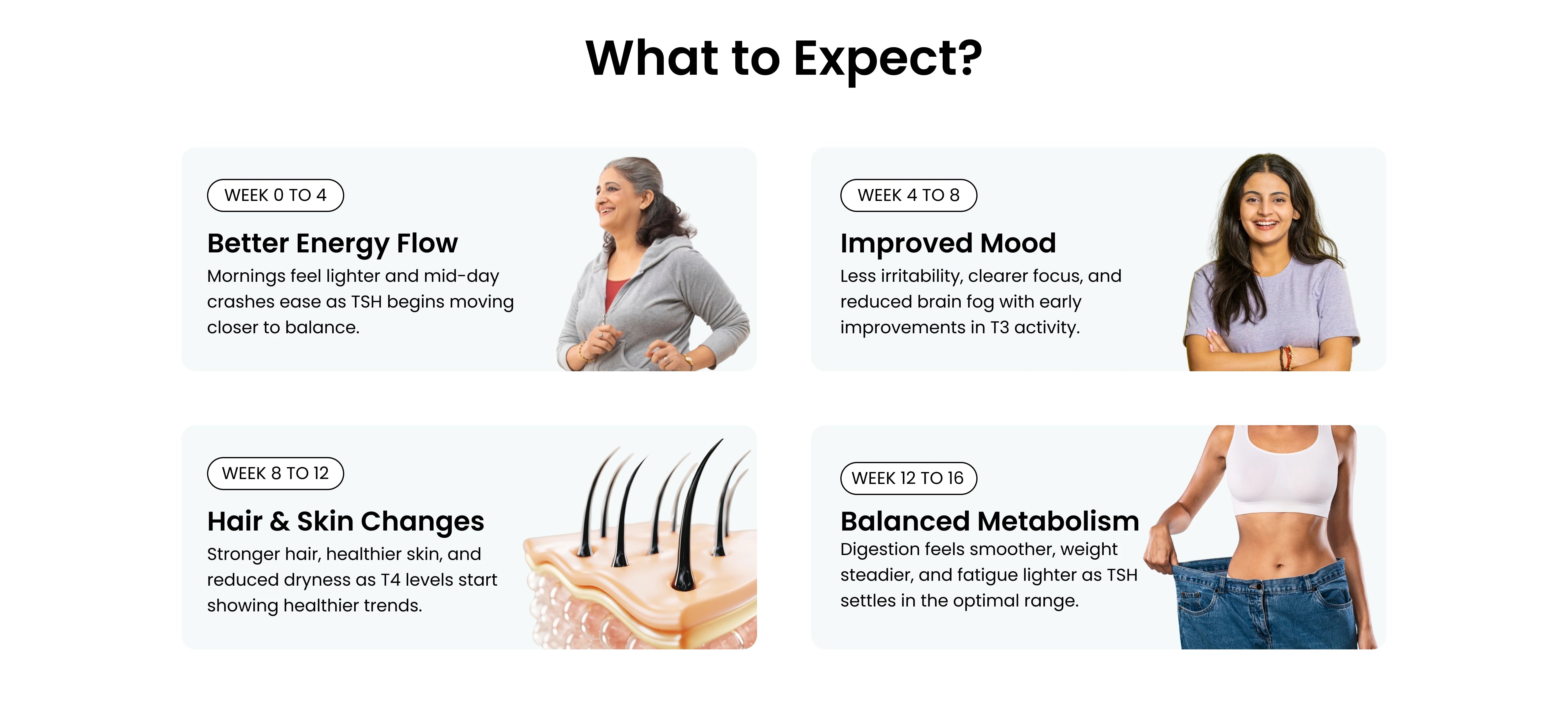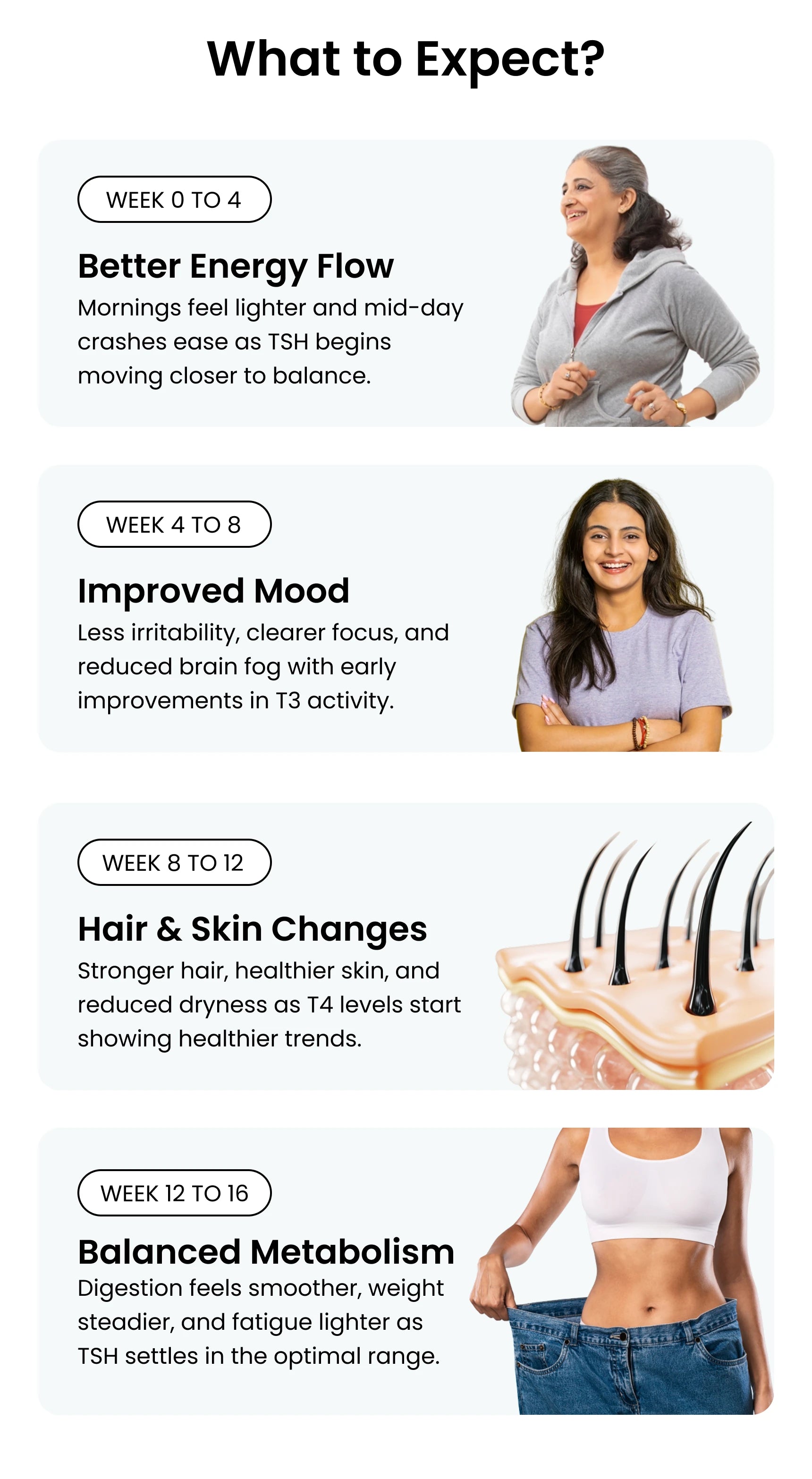 You may notice improved energy and reduced fatigue in 3-4 weeks. For full thyroid balance and metabolic benefits, use for at least 3 months.